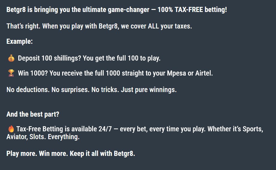 Betgr8 is one of the betting sites in Kenya which you will use without paying tax. One condition is that your stake must be Ksh100 and above. If you win Ksh1,000 and above,you will get all your money. You will avoid being deducted 15% tax on the winnings.