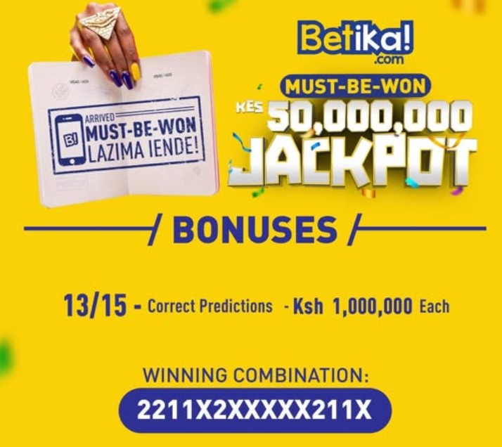 Betika Must Be Won jackpot bonuses have been awarded to winners. Only one person correctly predicted 13/15 games and he took home Ksh1,000,000.Bonuses are awarded for 0,13 and 14 correct games but the jackpot was difficult. The cash prize of Ksh50 million was also not won.